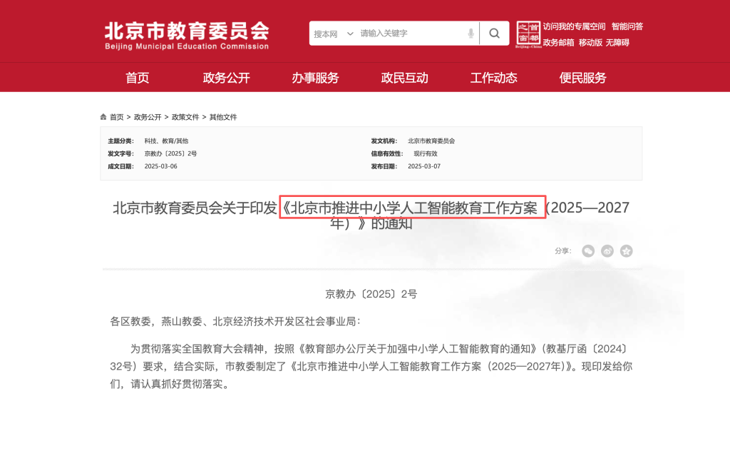 北京市教育委员会关于印发《北京市推进中小学人工智能教育工作方案(2025—2027年)》的通知
