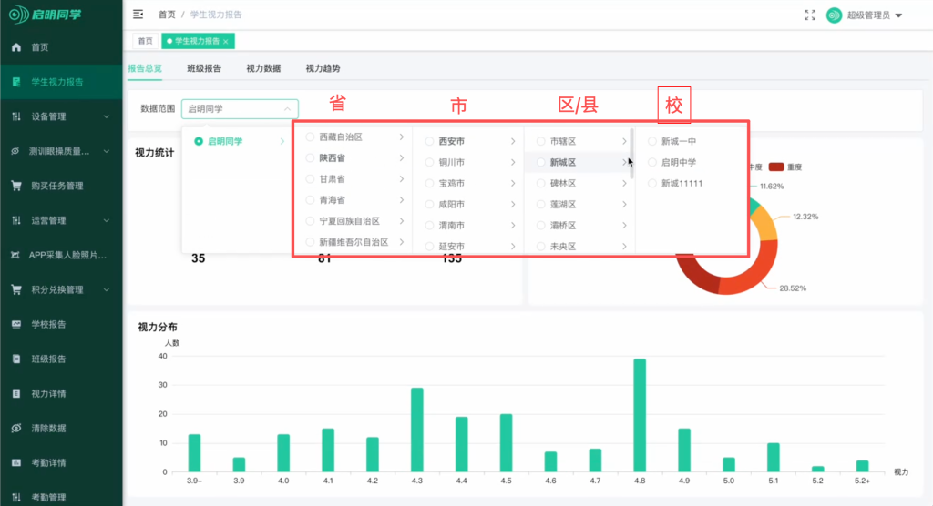 1、四级联动视力数据平台高效运作:覆盖“省—市—区/县—校”四个层级,学生个人层面详细记录每个学生的视力变化轨迹,家长可用通过小程序或者启明同学APP查看。平台具备强大的数据挖掘和分析功能,能够生成各类可视化报表,为学校管理者、教师、家长以及教育管理部门提供清晰直观的数据展示,有力支持科学决策。