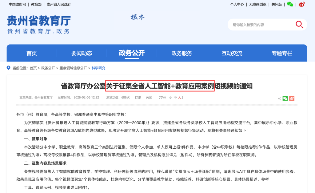《贵州省推进人工智能赋能教育行动方案(2026 – 2030年)》推行2个月后,公开征集全省“人工智能+教育”应用案例。遵循 “实操演示+场景适配” 原则,要求清晰展示AI工具在教育教学、学校管理、科研创新等流程中的使用步骤、效果呈现及应用价值,旨在为全省 AI 教育落地提供可参考、可推广的优质样本,解决政策落地 “缺方案、难复制” 的困境。