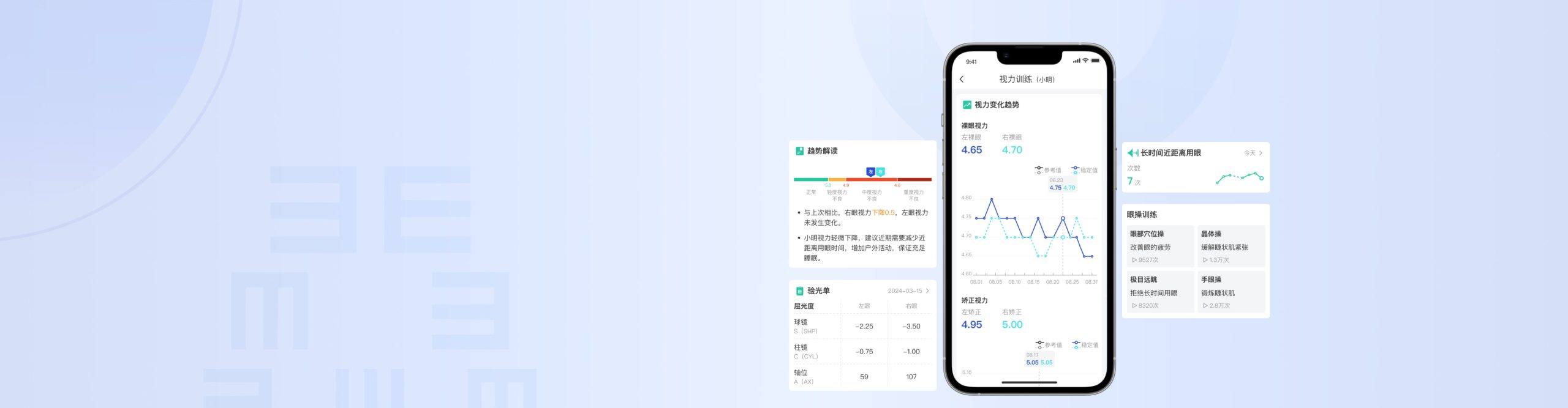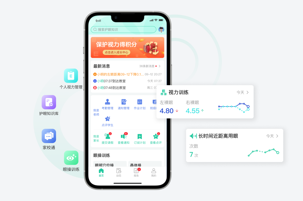 提供一站式眼健康及学生管理的手机应用平台,助力家庭、学校联动,共同守护中小学生眼健康。APP主要功能板块包括:个人视力管理、护眼知识科普平台、训练眼操、家校协同。