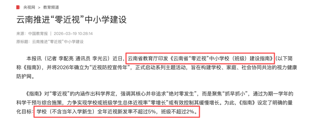 云南甚至提出“零近视”目标:学校全年近视新发率不超过 5%,班级不超过 2%。