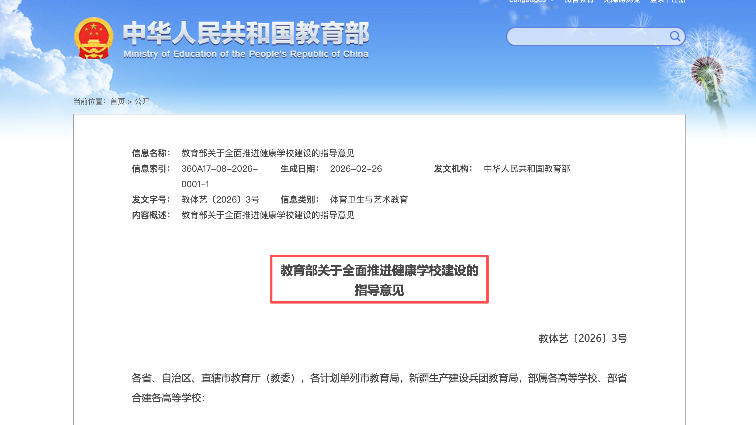 2026 年 2 月,教育部正式发布《关于全面推进健康学校建设的指导意见》,多项要求全面落地: