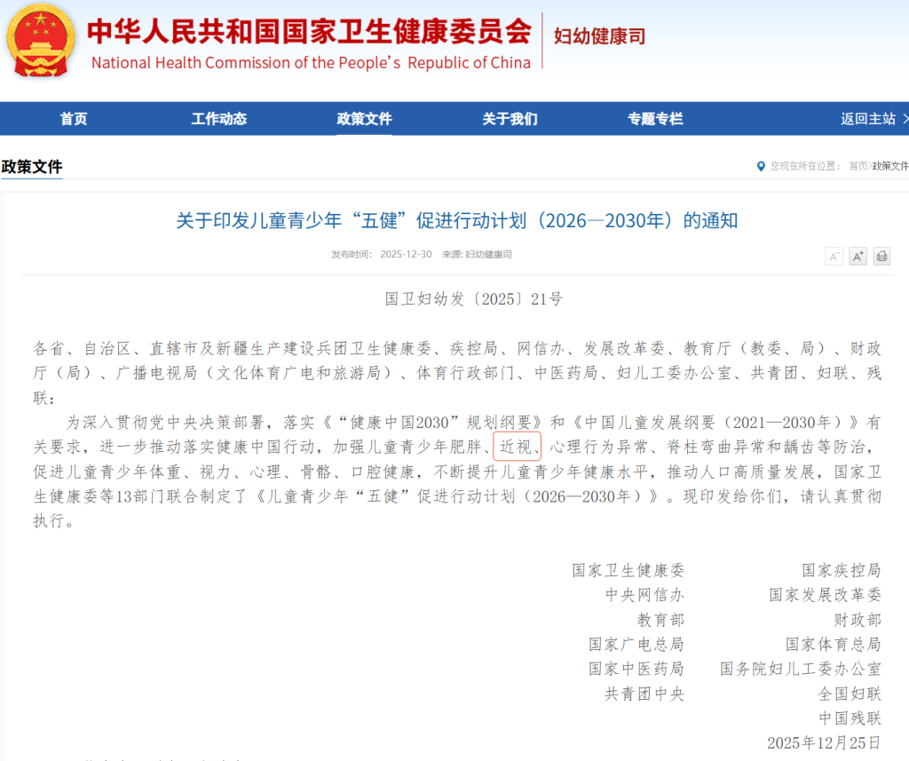 AI教育的落地不仅限于教学场景。在2025年12月30日,国家卫健委联合教育部等13部门印发了《儿童青少年“五健”促进行动计划(2026-2030年)》,将“近视防控”作为核心方向之一。政策明确要求到2030年,6岁儿童近视率控制在3%左右,小学生近视率下降到32%以下,初中生近视率下降到60%以下,高中阶段近视率下降到70%以下。制定“强化眼保健和视力检查、加强学校视力监测、建立完善儿童青少年视力健康电子档案,实施分级分类干预”等核心措施,这一场景与AI技术的结合,蕴藏着巨大的市场空间。