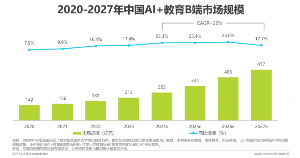 根据艾润咨询在2024年8月发布的最新报告《2024年人工智能+教育行业发展研究报告》,预计2026年中国人工智能教育B端市场规模将突破400亿元。随着基地数量翻倍、区域下沉加速,中小学AI教育配套产品将成为市场核心增量点。