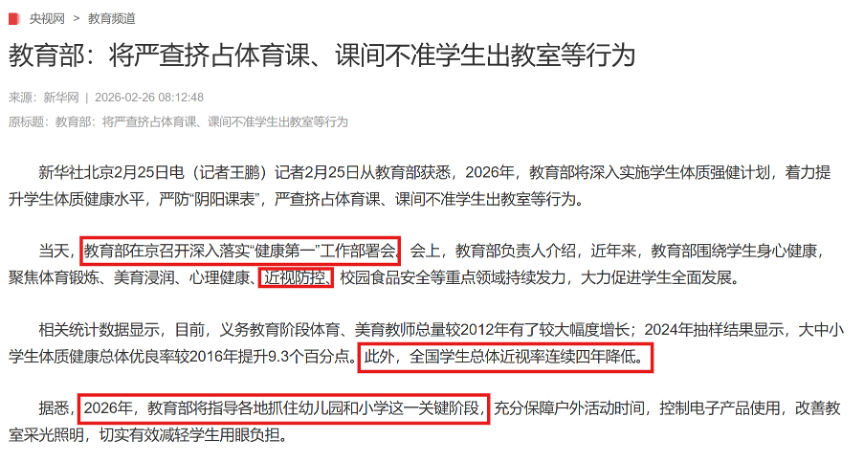 2026年2月25日,教育部召开新春第一会,部署学生身心健康工作,明确“健康第一”核心导向,其中近视防控被列为重点任务。会议明确小学是近视防控关键阶段,要求持续巩固全国学生近视率四年连续下降成果,推动防控工作精准化、常态化、体系化。