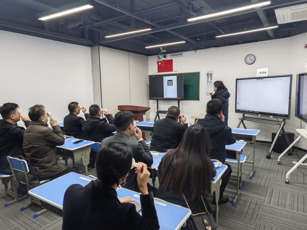 眼球只需要盯着大屏上面的E视标开口方向转动,不到5分种,整个参与测训的人裸眼视力和矫正视力都被准确测了出来。