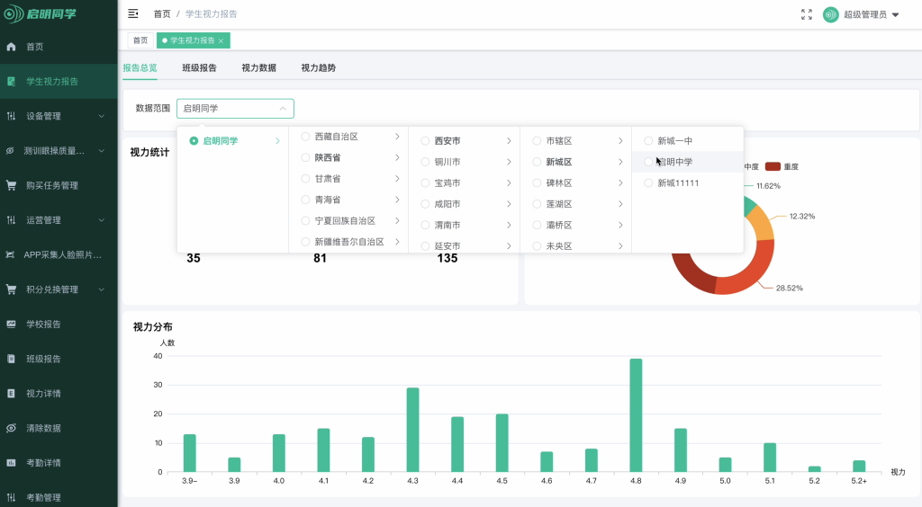 更值得关注的是,测训结束数据直接到管理后台,从学校、到县区、到市再到省,多级数据平台,这让各级部门能够精准制定近视防控策略。