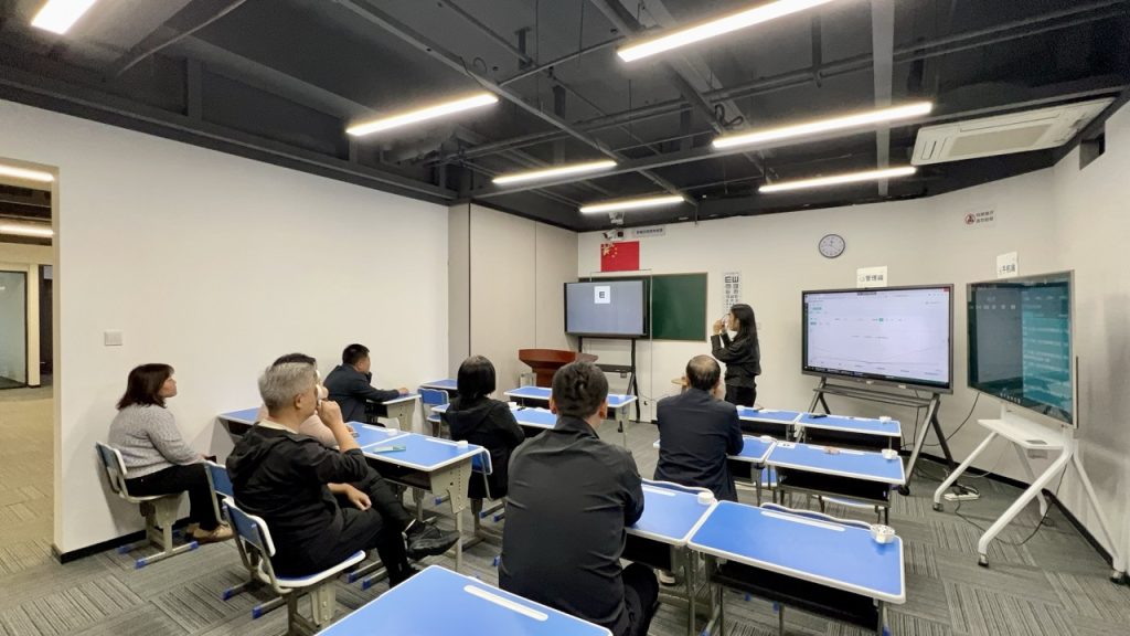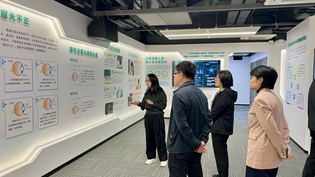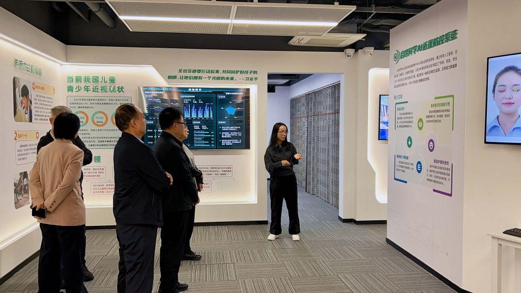 为了让调研团更直观地感受技术实力,领导们亲自进行了沉浸式体验。在模拟教室场景中,领导集体做了训练,5分钟内完成领导一行的视力训练,这种高效的训练与无感知的监测体验,让在场领导切身感受到了AI技术在真实教学场景中的巨大应用潜力。